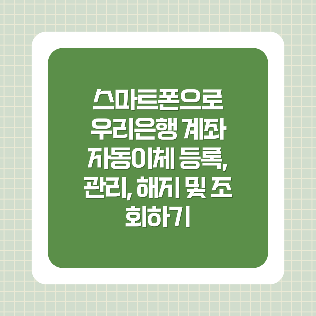 오늘은 우리은행 계좌의 자동이체 등록, 관리, 해지, 조회 방법을 스마트폰으로 간편하게 처리할 수 있는 방법을 소개해드리겠습니다. 우리은행에서 제공하는 모바일 앱인 "우리WON뱅킹" 앱을 통해 시간과 장소의 제약 없이 자동이체 서비스를 간편하게 이용할 수 있습니다.