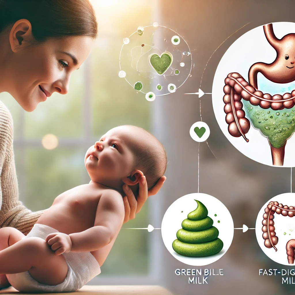 우리 몸에는 담즙이라는 소화액이 존재하는데, 이 담즙액은 녹색을 띠고 있습니다. 장에서 소화가 진행되면서 이 담즙액이 음식물과 섞여 대변이 우리가 흔히 아는 황금색으로 변하게 됩니다. 그러나 아기들은 모유나 분유만을 먹기 때문에 소화 속도가 매우 빠릅니다. 소화가 충분히 이루어지지 않은 상태에서 대변이 배출되면, 담즙액이 대변에 남아 초록색 변이 나오는 것이죠.
